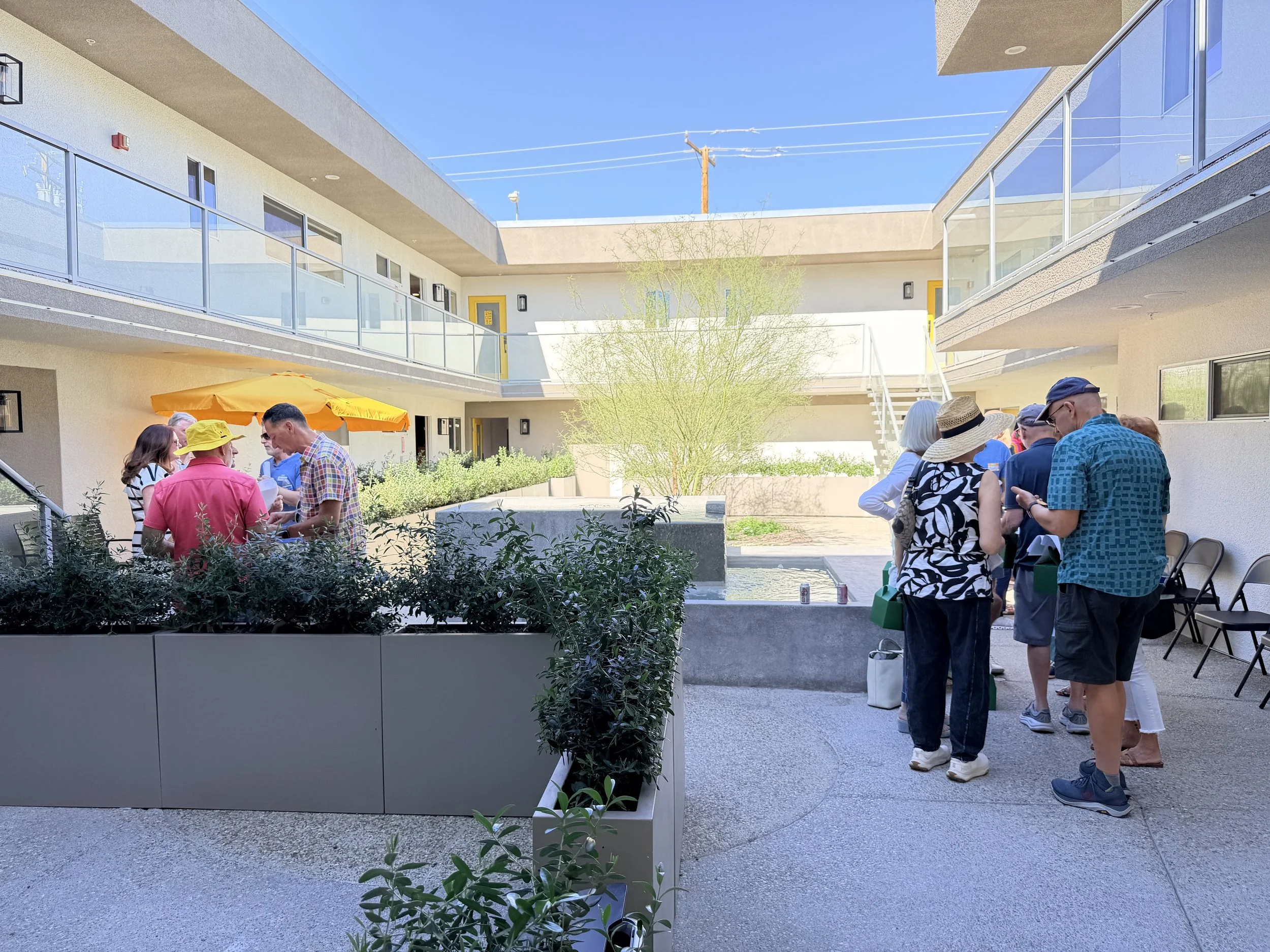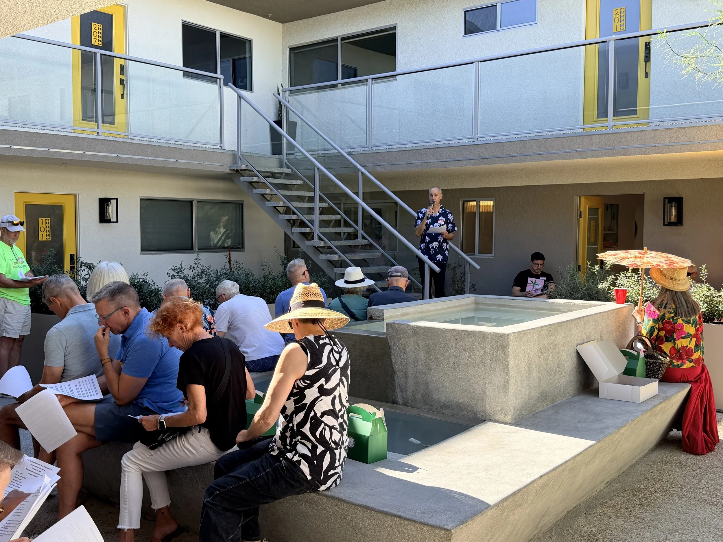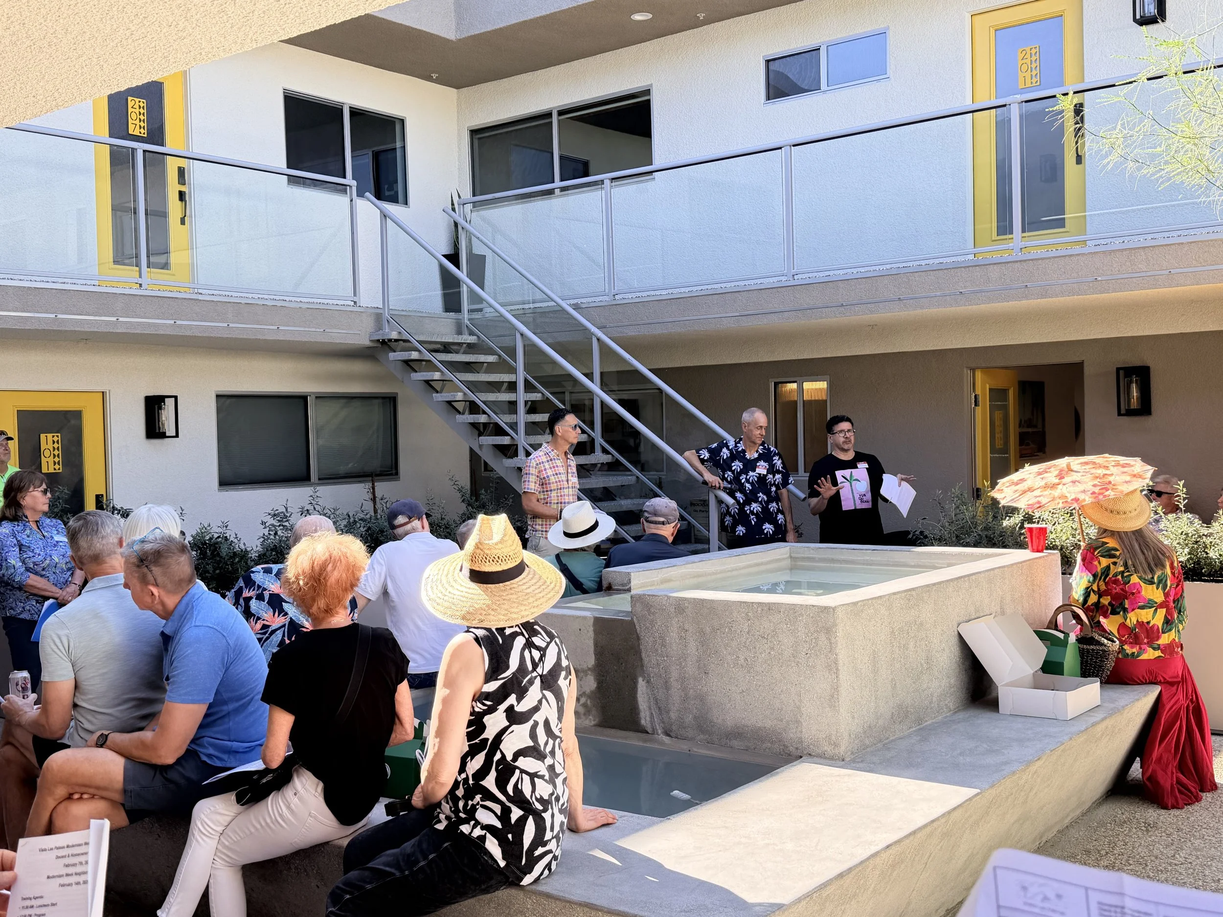 We are truly thrilled by the overwhelming response from volunteers eager to help showcase our beloved neighborhood. The training was hosted at Querencia Palms, a thoughtfully revitalized condominium community originally built in 1966 and inspired by midcentury Bauhaus design. With doors open, guests were able to wander through the residences and experience the architecture up close.